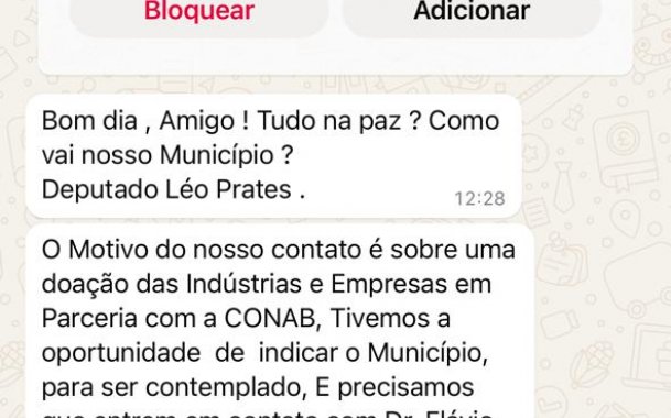 O deputado federal Leo Prates (PDT-BA) veio a público alertar e repudiar veementemente o uso indevido de seu nome em tentativas de golpe que têm como alvo prefeitos e gestores municipais da Bahia. Criminosos estão utilizando mensagens falsas para se passar pelo parlamentar ou por sua equipe, oferecendo supostas doações de materiais em parceria com empresas e com a Companhia Nacional de Abastecimento (CONAB).